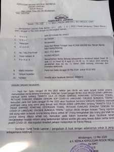 Dalam Laporan polisi nomor LP/10/V/2020/Polda Lampung, Polres Mesuji KSPK Tanggal 12 Mei 2020, pelapor atas nama Nama Aan Setiawan, jabatan Kepala Biro media siber sinarlampung.co melaporkan penyebaran berita bohong sebagaimana yang dimaksud dalam pasal 28 ayat 1 junto pasal 45 a ayat 1 undang-undang RI nomor 19 tahun 2016 tentang perubahan atas undang-undang nomor 11 tahun 2008 tentang informasi dan transaksi elektronik.