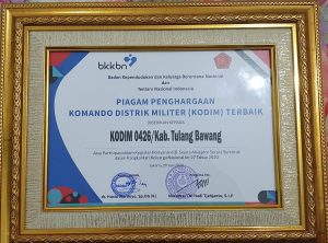 Tulang Bawang (SL)-Komandan Kodim (Dandim) 0426/Tulang Bawang Letkol Inf Kohir menerima piagam penghargaan dari BKKBN Provinsi Lampung, sebagai Kodim dengan Pelayanan KB Sejuta Akseptor terbaik, pada moment perayaan Hari Keluarga Nasional ke-27, di Ruang Minister Lantai 2 Hotel Novotel, Kel. Sukaraja Kecamatan Bumi Waras, Kota Bandar Lampung, Senin 20 Juli 2020.
