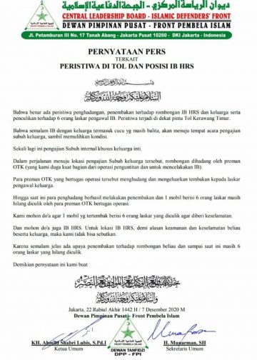 Wakil Sekretaris Umum Front Pembela Islam (FPI) Aziz Yanuar mengatakan bahwa rombongan kendaraan yang membawa Habib Rizieq Shihab dan keluarganya sempat dihadang dan ditembaki oleh orang tak dikenal (OTK) di suatu ruas jalan Tol di Jakarta, Senin 7 Desember 2020 subuh tadi. “Bahwa benar ada peristiwa penghadangan, penembakan terhadap rombongan IB HRS (Imam Besar Habib Rizieq Shihab] dan keluarga serta penculikan terhadap 6 orang laskar pengawal IB,” kata Aziz, Senin 7 Desember 2020.