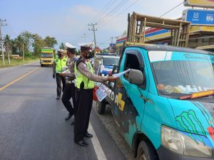 Tulang Bawang (SL) – Satuan lalu lintas (Satlantas) Polres Tulang Bawang membagikan takjil dan leaflet kepada para pengendara yang melintas di wilayah hukumnya pada Operasi Keselamatan Krakatau-2021.