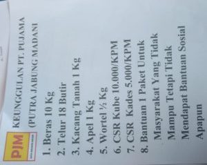 Tim wartawan menemukan selebaran di Lampung Timur yang bertuliskan Corporate Social Responbility (CSR) untuk kepala desa sebesar Rp.5.000/KPM yang bertuliskan huruf kapital PT. Putra Jabung Madani (PJM). Meski demikian, Humas perusahaan itu mengelak jika selebaran itu di bagikan oleh pihaknya. “Kami tidak tahu perihal selebaran itu, bisa jadi itu dari pesaing usaha kami,” Kata Usman, humas PT. PJM beberapa waktu lalu.