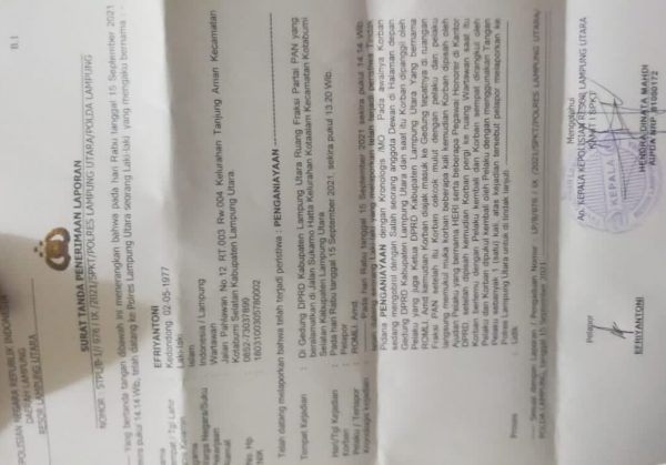 Peristiwa itu disaksikan ajudan Ketua DPRD, hingga staf honor Gedung DPRD yang melerai peristiwa tersebut. Korban kemudian melaporkan kasus tersebut Ke Polres Lampung Utara dengan bukti laporan polisi LP Nomor: STPL/B-1/976/IX/2021/SPKT/Polres Lampung Utara/Polda Lampung, tanggal 15 September 2021.