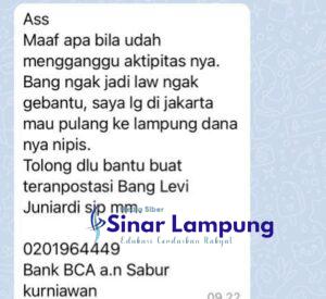 “Assalamualaikum maaf apabila udah mengganggu aktivitasnya. Bang ga jadi kalau ga ngebantu, saya lagi di Jakarta mau pulang ke Lampung dananya nipis. Tolong dulu bantu buat transfortasi bang Levi, Juniardi Sip MM,” kata pelaku dalam pesan singkat.
