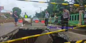 Lampung Utara (SL)-Ruas badan Jalan Nasional yang melintas di Jalan Alamsyah Ratu Perwira Negara, Kelurahan Kelapa Tujuh, Kecamatan Kotabumi, Kabupaten Lampung Utara amblas, dan menyisakan lubang besar menganga kedalaman 5 meter. Polisi menutup akses jalan, dialihkan ke jalur lain, Sabtu 4 Maret 2023.