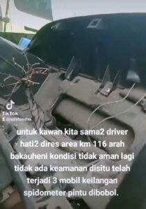 Terdengar suara perekam dalam video itu mengatakan ada tiga unit mobil hilang speedometer di KM 116 saat ditinggal oleh kernet ke warung beli nasi kurun waktu satu jam. “Mobil ini tiga buah hilang speedometer di KM 116 di posisi paling depan pom bensin,” kata perekam video.