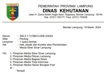 Dalam surat hak jawab berkop Dinas Kehutanan Lampung ditandatangani Kepada Dinas Kehutanan Ir Yanyan nomor 500.4.7.11/390/V.24/B.3/2024 prihal hak Jawab kepada sinarlampung, ditujukan kepada luka media, Ir Yayan Ruchyansyah juga menyinggung pasal-pasal Kode Etik Jurnalistik.