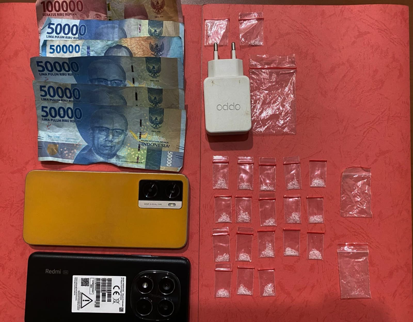 Selain itu, dalam operasi Gasak Narkoba ini juga, turut disita barang bukti (BB) berupa 2 (dua) bungkus plastik klip ukuran sedang dan 18 (delapan belas) bungkus plastik klip ukuran kecil yang berisi narkoba jenis sabu dengan total berat bruto 2,69 (dua koma enam puluh sembilan) gram, plastik klip ukuran besar kosong, plastik klip ukuran sedang kosong, kepala charger handphone (HP) merek Oppo, HP merek Oppo warna kuning, HP merek Redmi warna hitam, dan uang tunai sebanyak Rp 350 ribu.