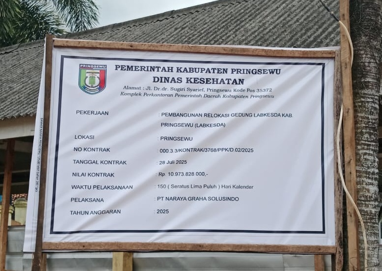 Proyek ini tercatat dilaksanakan oleh PT Naraya Graha Solusindo, berdasarkan kontrak nomor 000.3.3/KONTRAK/3768/PPK/D2/2025 tertanggal 28 Juli 2025, dengan waktu pelaksanaan 150 hari kalender. Papan proyek yang terpasang memuat keterangan bahwa kegiatan ini berada di bawah pengawasan Dinas Kesehatan Kabupaten Pringsewu.