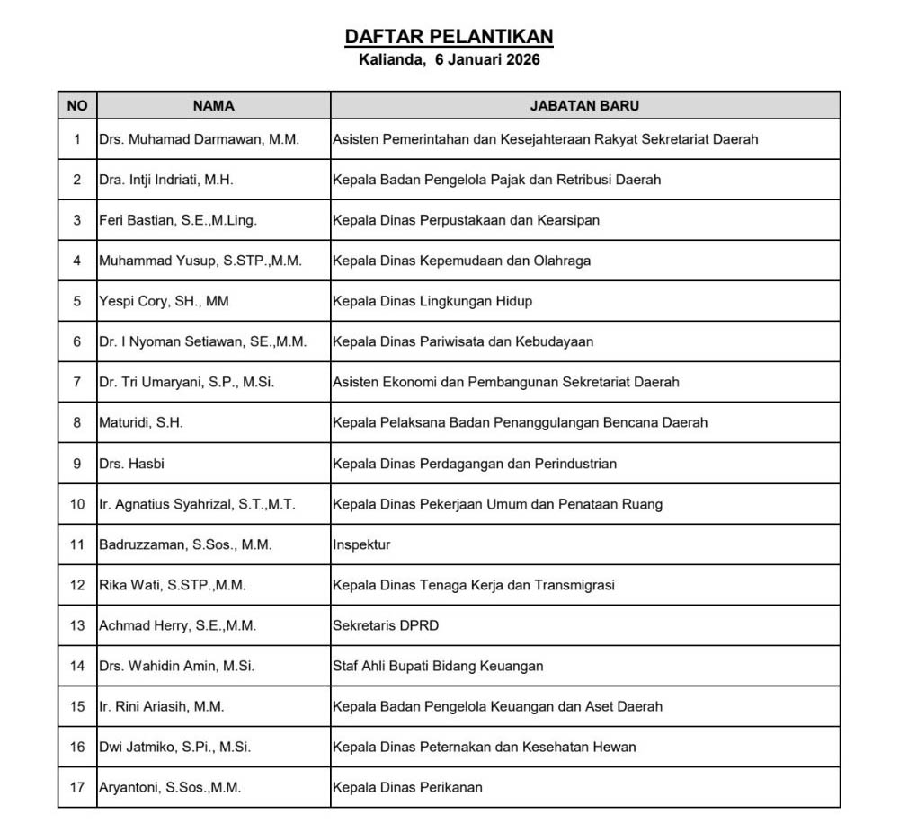 Sebanyak 17 pejabat yang dilantik menempati berbagai posisi strategis, mulai dari Kepala Dinas, Kepala Badan, hingga asisten di lingkungan Sekretariat Daerah. Bupati berharap para pejabat baru ini dapat segera melakukan akselerasi program kerja sesuai dengan visi misi daerah.