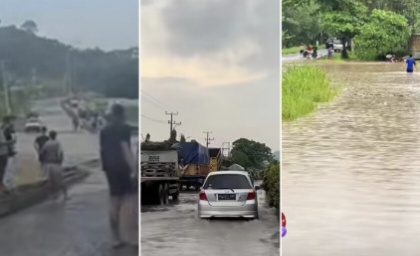 Jalan Soekarno-Hatta (Jalinsum): Genangan terpantau di dekat tanjakan PJR Km 8, Kelurahan Way Lunik, Kecamatan Panjang. Kendaraan dari arah Tanjung Karang menuju Bakauheni maupun sebaliknya harus melambat, memicu antrean panjang.