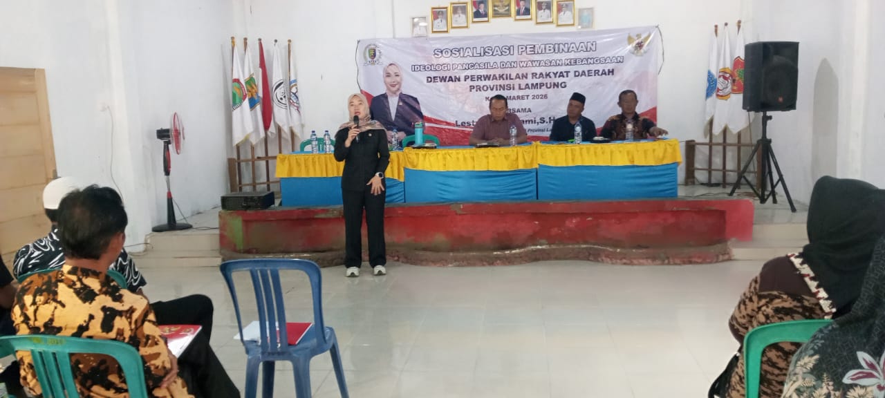 Lampung Selatan, sinarlampung.co – Anggota Komisi IV (Empat) DPRD Provinsi Lampung, Lesti Putri Utami, terus aktif turun ke tengah masyarakat. Politisi dari Fraksi PDI Perjuangan ini melaksanakan kegiatan sosialisasi Ideologi Pancasila di dua titik berbeda, yakni di Desa Pemulihan dan Desa Talang Way Sulan, Kecamatan Way Sulan, Kabupaten Lampung Selatan, pada Jumat (10/4/2026).