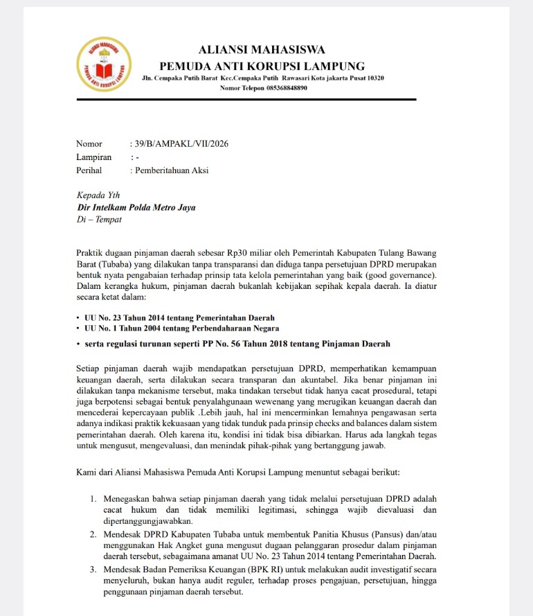 Tulang Bawang Barat, sinarlampung.co – Aliansi Mahasiswa Pemuda Anti Korupsi Lampung berencana menggelar aksi unjuk rasa pada Rabu, 22 April 2026, di Komisi Pemberantasan Korupsi (KPK) dan Kejaksaan Agung RI. Aksi ini dilakukan sebagai respons atas dugaan pinjaman daerah sebesar Rp30 miliar oleh Pemerintah Kabupaten Tulang Bawang Barat (Tubaba) yang dinilai tidak transparan dan diduga tanpa persetujuan DPRD.