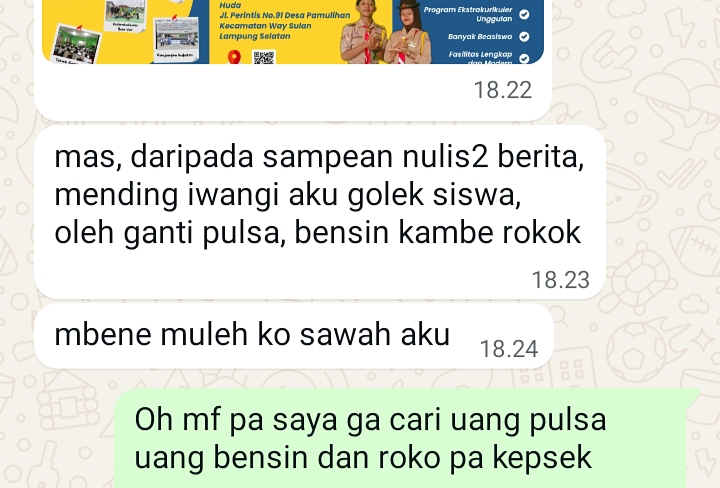 “Mas, daripada sampean nulis-nulis berita, mending ewangi aku golek siswa. Oleh ganti pulsa, bensin kambi roko,” balas Eka sambil mengirimkan brosur penerimaan siswa baru.