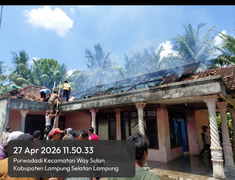 Lampung Selatan, sinarlampung.co – Rumah milik Muhadi, warga Dusun Bandung Jaya, Desa Purwodadi, Kecamatan Way Sulan, Lampung Selatan, ludes dilalap api, Senin (27/4/2026), sekitar pukul 10.00 WIB.